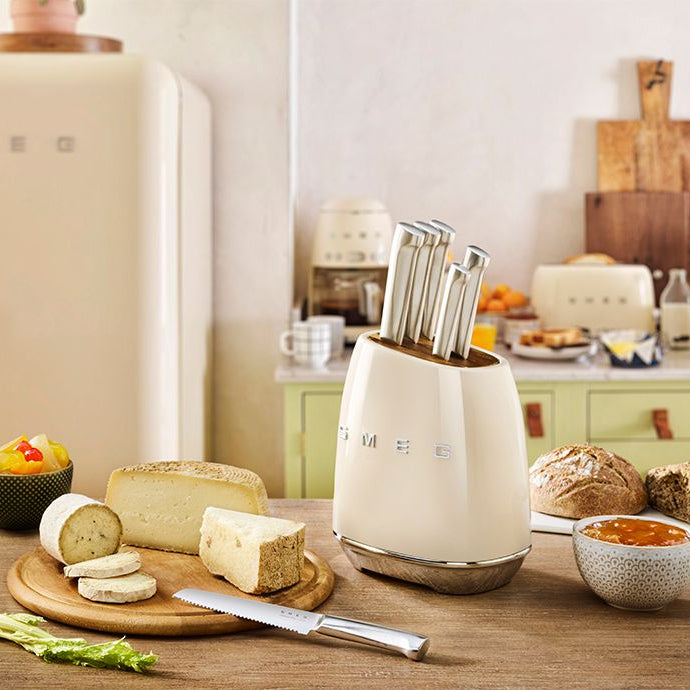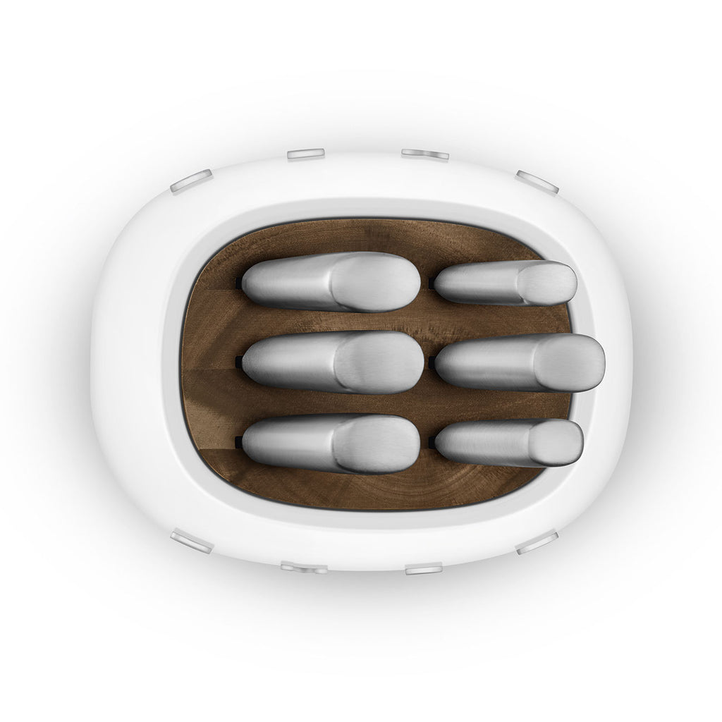 Il set è composto da sei coltelli essenziali, ciascuno progettato per soddisfare esigenze specifiche: un coltello da verdura da 8 cm; un coltello multiuso da 13 cm, versatile e ideale per cibi di varia consistenza; un coltello da carne da 15 cm; un coltello Santoku da 18 cm, ideale per tagliare carne, pesce e verdure; un coltello da pane da 19 cm; e infine un coltello da chef da 19 cm, il tuttofare indispensabile in ogni cucina.